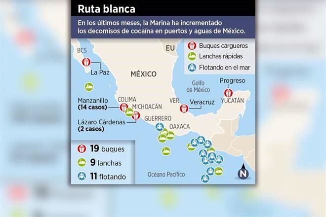 La droga ha sido ubicada en contenedores de 17 buques cargueros de líneas marítimas internacionales, en casi una decena de lanchas rápidas con motores fuera de borda o flotando en el mar frente a las costas de Chiapas, Oaxaca, Guerrero y Colima.