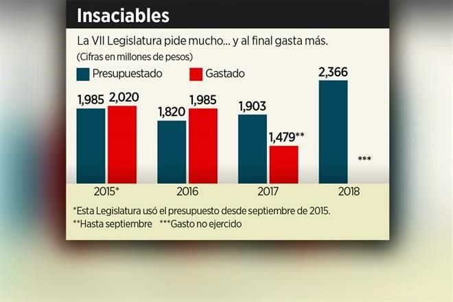 Del total de recursos que pidió para 2018, la VII Legislatura prevé gastar mil 664 millones de pesos en "servicios personales", como el pago de sueldos, y 373 millones más, en servicios generales.