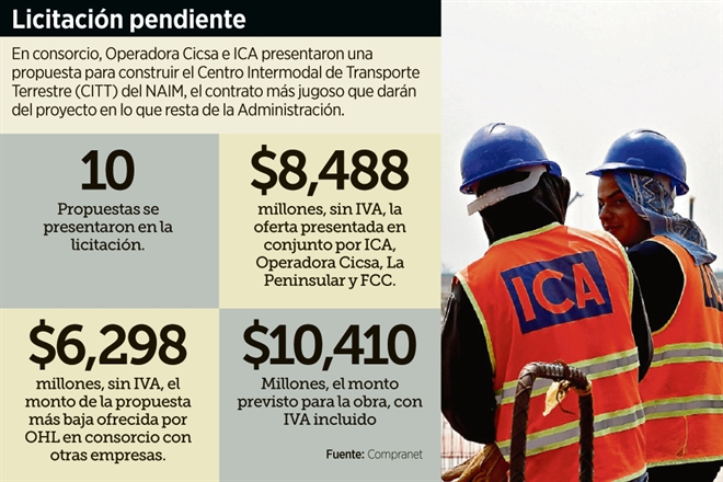 El contrato más jugoso, el del edificio terminal, por un monto de 89 mil 873 millones de pesos de 2018 sin IVA, lo ganaron ICA y Operadora Cicsa de Slim, quien ya tiene una importante presencia en el NAIM, pues, según información de Reuters, mediante Grupo Financiero Inbursa, habría comprado hasta 43 por ciento de los certificados de Fibra E para financiar la construcción.