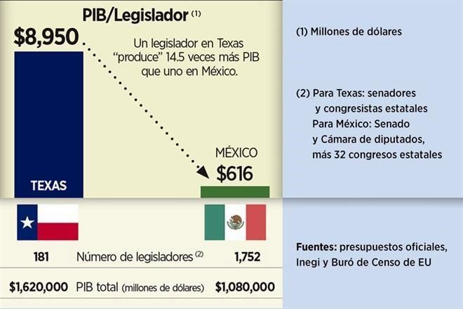 Aunque el Producto Interno Bruto (PIB) de Texas es 50 por ciento superior al de México, el presupuesto total destinado a la actividad legislativa en este Estado estadounidense equivale apenas a la décima parte del gasto mexicano en relación al tamaño de sus economías.