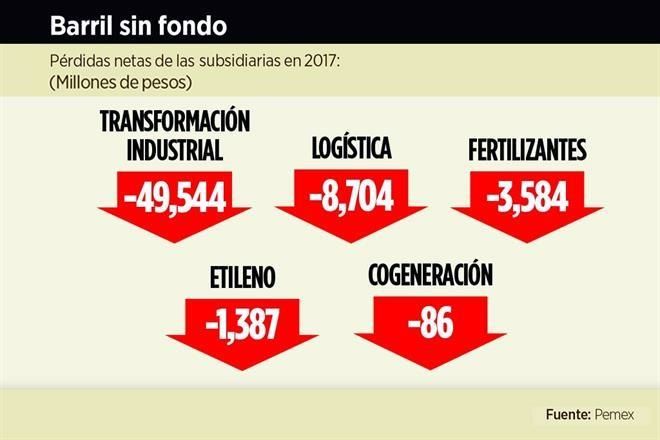 Tras la reforma energética, Pemex creó seis nuevas subsidiarias en 2015, de las cuales cinco le generaron pérdidas netas de 63 mil 305 millones de pesos tan sólo en 2017.