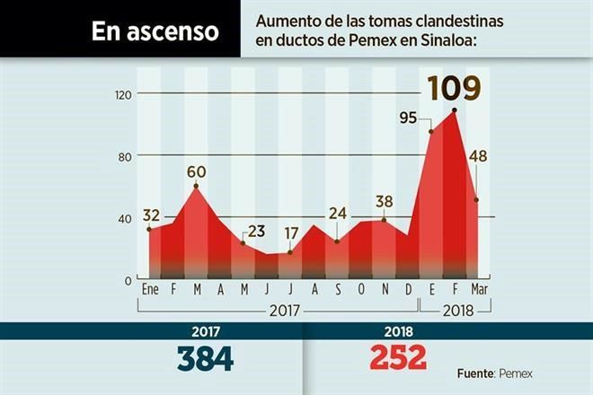 En lo que va de este año, la petrolera ha detectado ahí un promedio de tres tomas clandestinas por día, con lo cual Sinaloa ya es parte de las ocho entidades que concentran el 80 por ciento de la ordeña en el País.