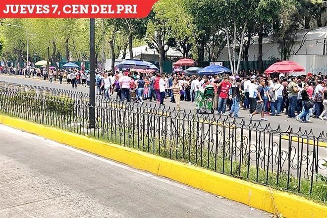 | En la sede nacional del PRI cientos de personas hacen fila para ingresar con su credencial de elector y una copia; en la entrada les embolsan el celular y algunos reportaron haber recibido dinero. Foto: Shelma Navarrete |
