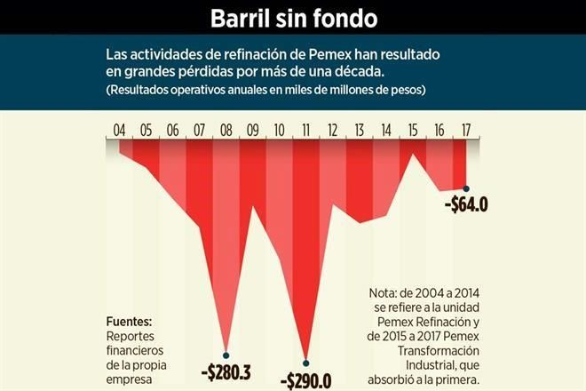 Tan sólo en el 2017, la unidad Transformación Industrial de Pemex, que consolida a las refinerías, perdió 63 mil 989 millones de pesos, el 79 por ciento del presupuesto para la Defensa Nacional para el año en curso.