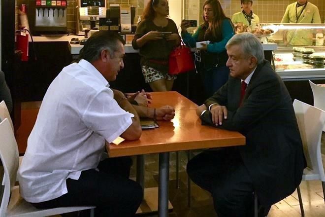 López Obrador tuvo un breve diálogo con "El Bronco" en la mesa de uno de los restaurantes de la terminal aérea, y cada quien partió por su lado.