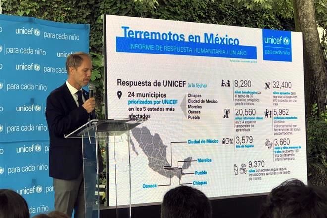 Al presentar, el "Informe de la situación humanitaria de niñas, niños y adolescentes a un año de los terremotos Unicef México", detalló que 7 millones de niños que viven en los estados afectados todavía tienen necesidades que no han sido cubiertas.