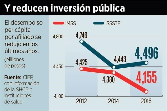 Según el Centro de Investigación Económica y Presupuestaria (CIEP), el gasto de bolsillo por individuo, integrado por el gasto en atención primaria, hospitalaria y medicamentos, subió en el IMSS de mil 958 pesos al año en 2014 a 2 mil 125 para 2016, es decir, 168 pesos más.