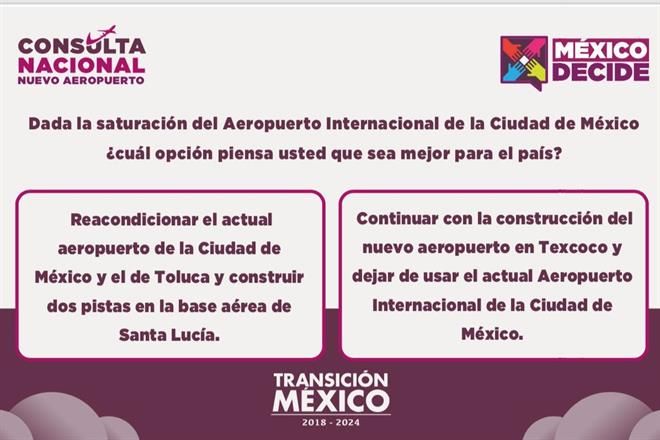 Del 25 al 28 de octubre se le preguntará a la gente si quiere seguir adelante con el proyecto Texcoco de 13 mil millones de dólares o buscar una alternativa más barata, pero más lejos de la Ciudad de México.