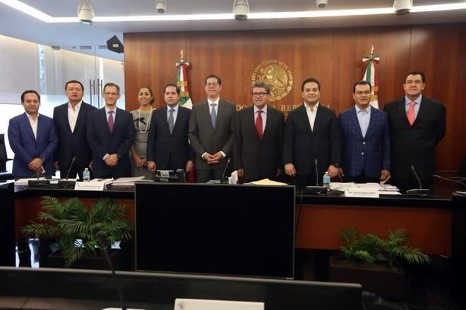 | Los coordinadores parlamentarios de la Cámara alta con funcionarios de la SE. Foto: Óscar Mireles |