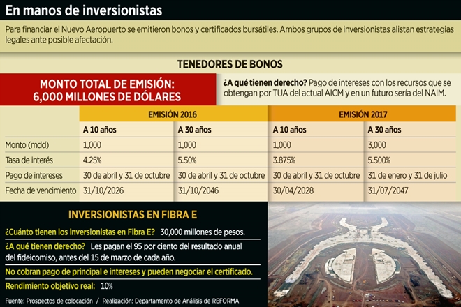 El pago de estos bonos está respaldado por los ingresos de la Tarifa de Uso Aeroportuario (TUA) del Aeropuerto Internacional de la Ciudad de México (AICM) y los recursos captados servirían para construir el NAIM, que será cancelado.