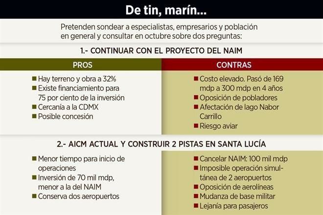 El 5 de septiembre, dijo, se espera tener la opinión de los ingenieros y las organizaciones civiles y empresariales, para que el 8 de ese mismo mes se den a conocer todos los dictámenes recibidos y las opiniones, con lo cual se presentarán las bases para los foros de discusión en radio, televisión, periódicos y redes sociales con la participación de quienes estén a favor y en contra de cualquiera de las dos opciones.