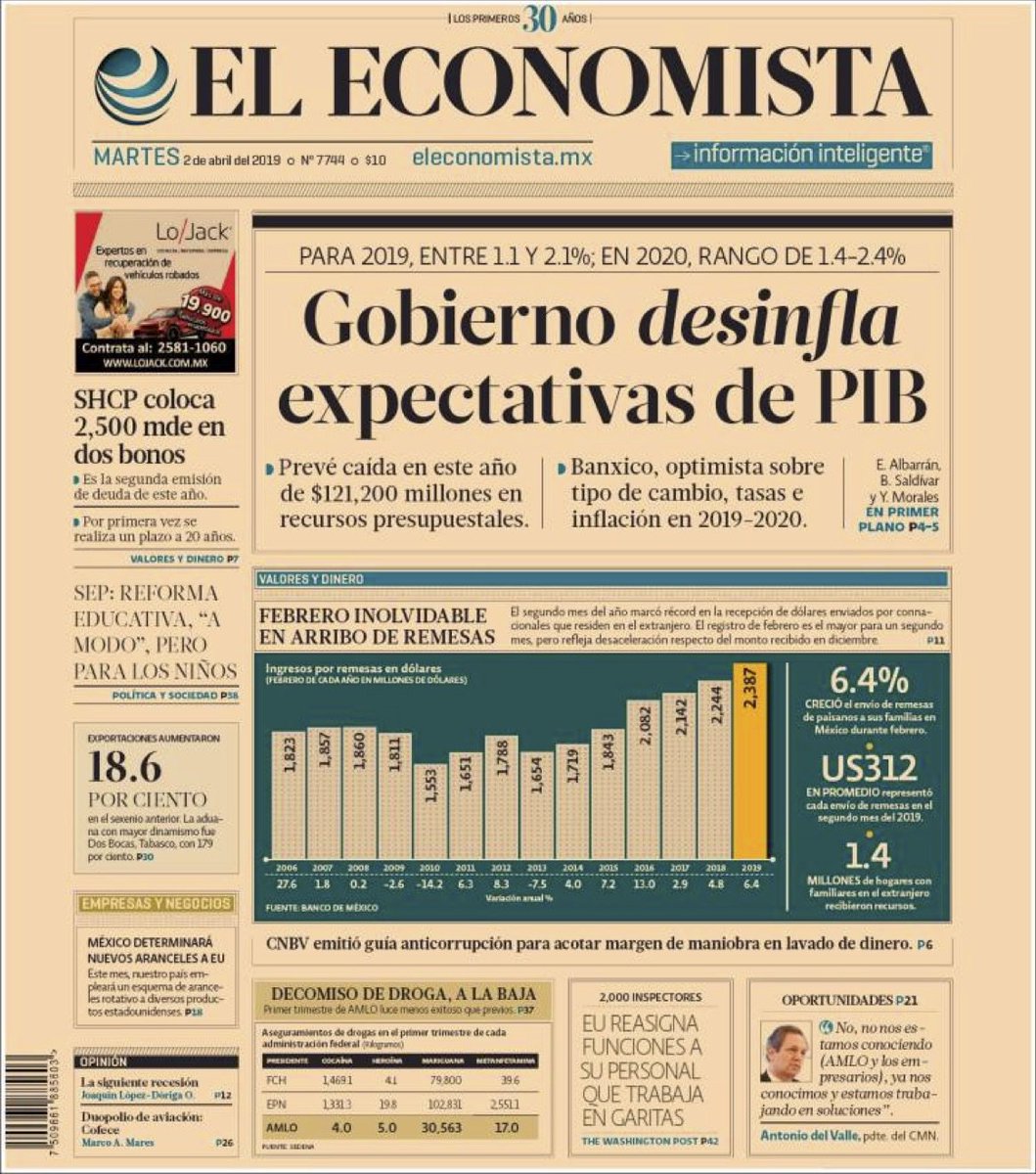 Aumentan remesas; ligan 35 meses al alza En febrero de este año las remesas de los mexicanos en el exterior sumaron 2 mil 387.3 millones de dólares, 6.4 por ciento más respecto al mismo mes de 2018, su mayor alza para un periodo similar en tres años y con ello ligan 35 meses al alza a tasa anual. El Banco de México informó que en el primer bimestre de 2019 las remesas familiares sumaron cuatro mil 802.3 millones de dólares, lo que implicó un avance de 6.4 por ciento respecto al periodo enero-febrero del año pasado. En febrero pasado las remesas registraron un ritmo a tasa anual similar a los últimos dos meses, pero aún por debajo del 10.5 por ciento de 2018, lo que podría reflejar un menor crecimiento del empleo de migrantes. La institución financiera mantiene su expectativa de un ritmo de expansión más bajo para las remesas durante 2019.