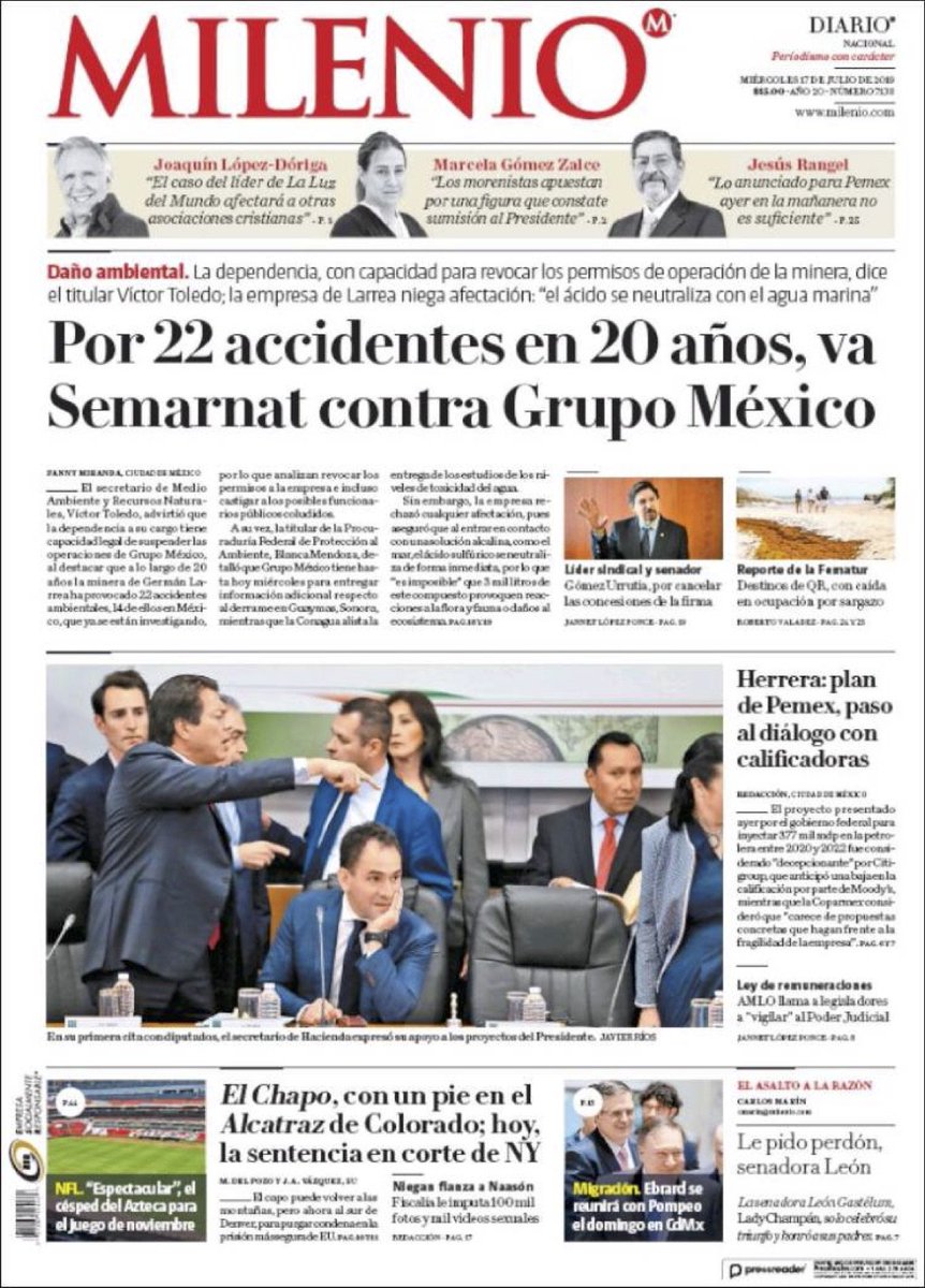 “Este es el accidente número 22 de Grupo México. Desde 1998 han estado provocando accidentes no solamente en el país sino también en Perú, Estados Unidos y España (...) Estamos ante una situación especial de una firma industrial que ha tenido repetidamente 22 accidentes; no es para menos. Cuando una compañía o industria está con este currículum, con esta trayectoria, la Semarnat tiene la capacidad legal para suspenderla, claro que nos estamos enfrentado a una enorme empresa”, señaló. En conferencia de prensa, el funcionario dijo que la Semarnat realizará una “revisión cuidadosa” de los desastres ambientales provocados por Grupo México, que incluye el último derrame de 3 mil litros de ácido sulfúrico al mar de Cortés y el de 40 mil metros cúbicos del mismo tóxico al río Sonora hace cinco años.