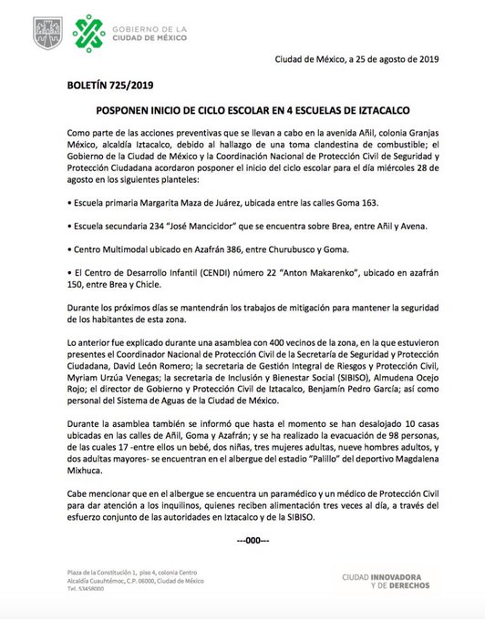 Debido a la fuga de combustible en la colonia Granjas México, en la alcaldía de Iztacalco, se retrasa hasta el miércoles 28 de agosto el regreso a clases en cuatro escuelas cercanas. Te recomendamos: Tras flamazo, Sheinbaum recorre zona de toma clandestina en Iztacalco La jefa de Gobierno, Claudia Sheinbuam, informó que los planteles donde no habrá actividades este lunes 26 de agosto son: Escuela primaria Margarita Meza de Juárez, ubicada en la calle Goma 163. La secundaria 234, José Mancicidor, localizada en Brea, entre Añil y avenida Avena. El Centro de Desarrollo Infantil (Cendi) 22, Antonio Makarenki, ubicado en Azafrán 150, Brea y Chicle. El Centro Multimodal, ubicada en Azafrán 386, entre Churubusco y Goma. El retraso se debe a la seguridad de los habitantes mientras se realizan los trabajos de mitigación.