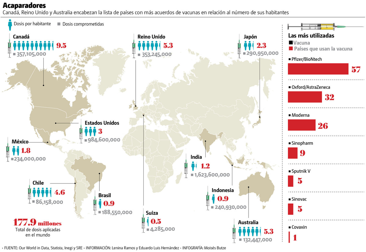 Ciudad de México. La cifra de vacunas contra el Covid-19 que México ha contratado y comprometido es de 234 millones 330 mil dosis. Con ellas podrá inocular a 134 millones 660 mil habitantes, informó la Secretaría de Relaciones Exteriores (SRE). Por su parte el presidente de la República, Andrés Manuel López Obrador, y el canciller Marcelo Ebrard comentaron que en el seno del Consejo General de Seguridad de la ONU en Nueva York, México expondrá sus argumentos en contra del acaparamiento del antiviral por parte de los países productores, hecho que genera el desamparo en las naciones menos favorecidas.